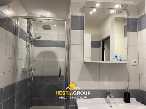 Nová kuchyňská linka s myčkou, digestoří, sklokeramickou deskou, lednicí, v koupelně naleznete velmi prostorný sprchový kout, pračku a přípravu na umístění sušičky a 80l bojler na ohřev vody.