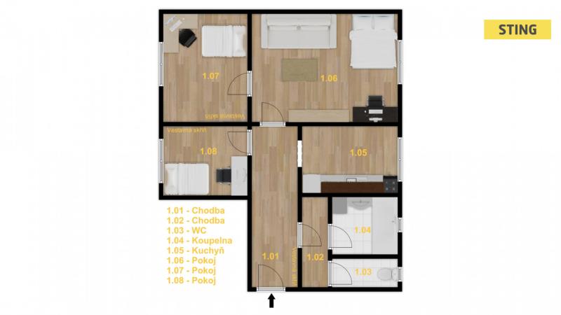 Dominantou bytu jsou tři prostorné a světlé pokoje: obývací pokoj 20,51 m², další dva pokoje o výměrách 15,39m² a 11,21 m². Ve dvou pokojích jsou instalovány praktické vestavné skříně. Na podlahách je položen vinyl, který je odolný a snadný na údržbu.