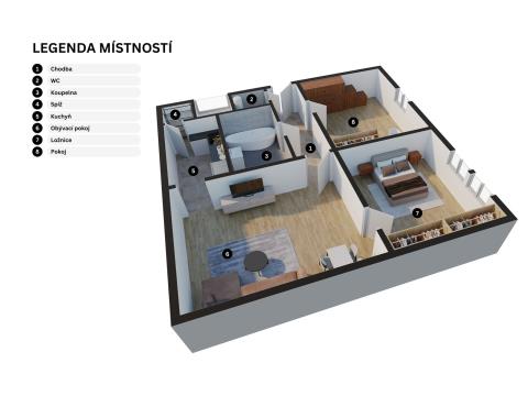 Bytová jednotka se prodává částečně vybavená nábytkem, v kuchyni o ploše 2,9 x 2,9 m ( 8,4 m2 ) s komorou o ploše 1,5 x 0,95 m ( 1,4 m2 ) je kuchyňská linka s elektrickým sporákem s horkovzdušní troubou, myčkou nádobí, odsávačem pár a kombinovanou lednicí. V obývacím pokoji o ploše 6,1 x 3,1 m ( 19 m2 ) je jídelní stůl se židlemi a obývací sestava, v dětském pokoji o ploše 2,8 x 5,5 m ( 15,4 m2 ) je vyvýšené patro s dvojlůžkem a úložními prostory, dále je zde skříň a pracovní stůl. V ložnici o ploše 5,5 x 3,85 m ( 21,2 m2 ) je umístěna manželská postel, komoda a šatní skříň. V chodbě o ploše 4,1 x 1,5 m ( 6,2 m2 ) je snížení strop s úložním prostorem. Obývací pokoj s kuchyní je orientován na severozápad s výhledem do zahrady vnitrobloku, ložnice a dětský pokoj jsou orientovány na jihovýchod s výhledem do ulice Petřínská. V koupelně o ploše 1,6 x 2,9 m ( 4,6 m2 ) je kromě vany a umývadla, umístěna pračka se sušičkou. Na podlaze pokojů je položena plovoucí laminovaná podlaha, v obývacím pokoji je lino, v předsíní, kuchyni, koupelně a toaletě je položena keramická dlažba. Topení je v pokojích zabezpečeno elektrickými infrapanely, na toaletě o ploše 1,5 x 1,25 m ( 1,9 m2 ) je umístěn elektrický bojler na teplou vodu. V bytové jednotce je nainstalovaná telefonní přípojka s možností zapojení kabelové televize a internetu. K bytu přináleží sklep a je možné využívat i zahradu ve vnitrobloku domu.