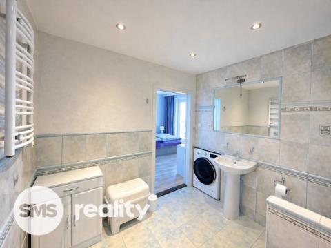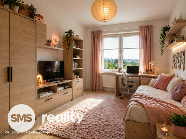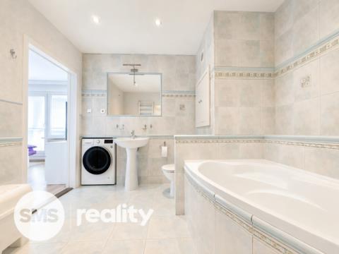 Dále z předsíně pokračujete do menšího pokoje, ideálního jako dětský pokoj či pracovna, aktuálně je pokoj využíván pro uskladnění, před stěhováním - viz. vizualizace. Na pravé straně se nachází prostorná koupelna s rohovou vanou a toaletou. Z koupelny je vstup do samostatné ložnice, ze které je přímý vstup na lodžii – ideální místo pro ranní kávu či relax.