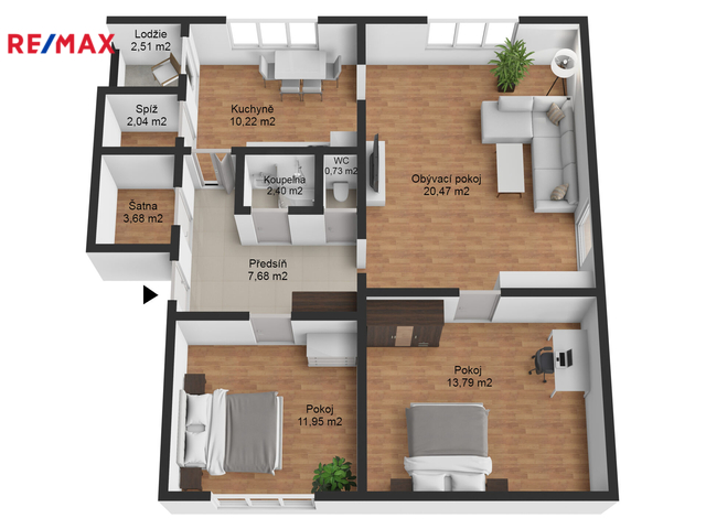kuchyně 10,22 m², obývací pokoj 20,47 m², pokoj 13,79 m², pokoj 11,95 m², koupelna 2,40 m², WC 0,73 m², chodba 7,68 m², komora 3,68 m², spíž 2,04 m², lodžie 2,51 m² a sklep 7,39 m² (viz půdorys v nabídce).