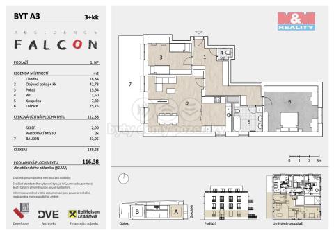 Nově spouštíme prodej bytových jednotek v budově A projektu Residence Falcon, který vzniká v klidné části Mělníka – ul. Sokolská. Lokalita nabízí výbornou dostupnost do Prahy (30 minut od Letňan, spojení PID), kompletní občanskou vybavenost v místě a základní školu doslova za rohem. Klidné prostředí bez dopravní zátěže doplňuje blízkost přírody i možností pro sport a volný čas. Byt se nachází ve 1. podlaží a nabízí dispozici 3+kk o výměře 116,38m². K jednotce náleží balkon 24m², sklep 3 m² a dvě parkovací stání. Klienti mají na výběr ze dvou vysokých standardů vybavení – Friendly a Gorgeous, zahrnujících velkoformátová okna, izolační trojskla a kvalitní materiály. Rezidenční areál nabídne oplocení, kamerový systém, kontrolovaný přístup a chráněné atrium pro klidnou relaxaci. Výstavba začne ve 3. čtvrtletí 2025, dokončení je plánováno na srpen 2027. Architektonický návrh zpracovalo renomované studio DVĚ. Pro více informací neváhejte kontaktovat makléře!