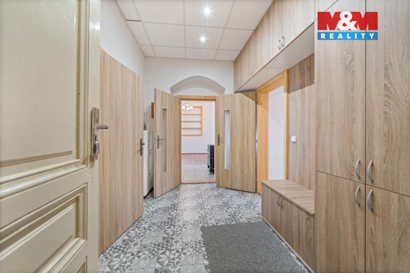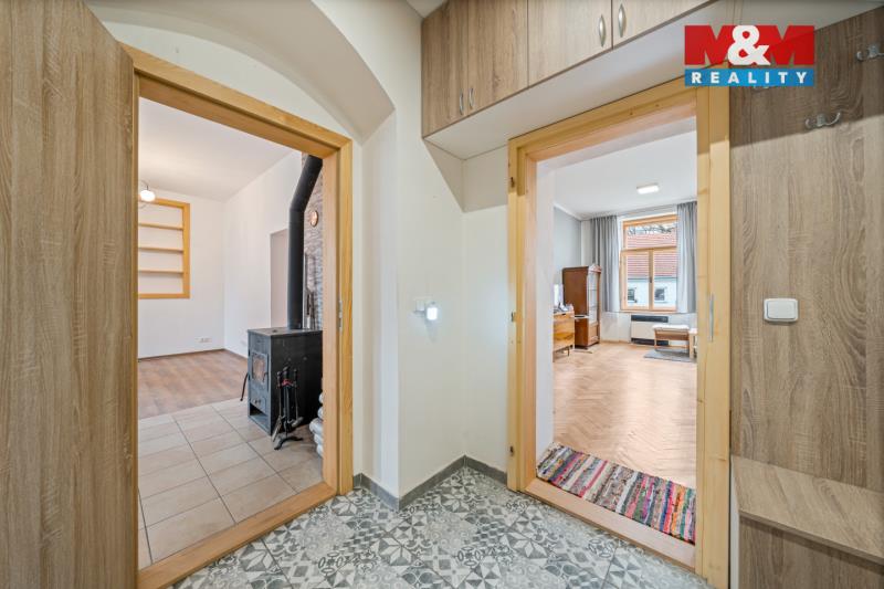 Nabízíme k prodeji prostorný byt 3+kk v Nové Bystřici, situovaný v 1. podlaží historické budovy s jedinečnou atmosférou první republiky. Byt je po rekonstrukci, působí vzdušně a nabízí praktické dispoziční řešení s podlahovou plochou 102 m². Ve dvou místnostech jsou dřevěné parkety, které podtrhují charakter bytu, a v obývacím pokoji i ložnici se nachází krbová kamna. Vytápění je také řešeno plynovými WAW kamny. Byt disponuje dvěma koupelnami – technickou s bojlerem a druhou klasickou s přístupem z kuchyně. Velká chodba nabízí dostatek úložného prostoru. Vhodné i pro vícegenerační bydlení. K bytu náleží dva prostorné sklepy a podíl na pozemku za domem. Klidná lokalita a zajímavý charakter nemovitosti činí z bytu ideální volbu pro bydlení i investici.