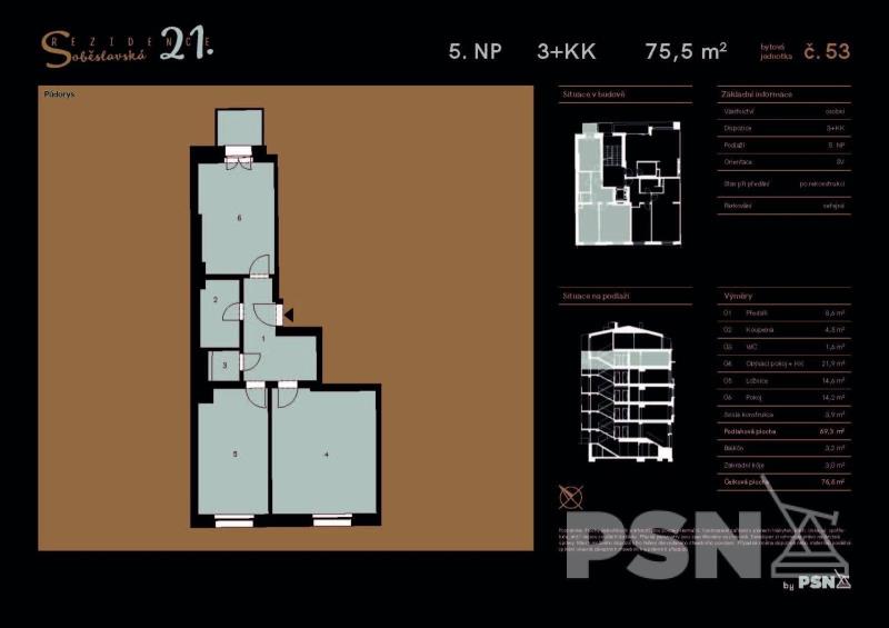 Prostorný byt 3+kk s balkonem Jednotka o dispozici 3+kk a podlahovou plochou 69,3 m² je součástí moderní Rezidence Soběslavská – kompletně zrekonstruovaného domu v oblíbené části pražských Vinohrad. Byt se nachází v 5. nadzemním podlaží a nabízí pohodlné bydlení s vysokým standardem a promyšleným řešením pro každodenní život. Dominantou bytu je světlý obývací pokoj s kuchyňským koutem, ideální pro společné chvíle i relaxaci. Dvě samostatné ložnice poskytují dostatek soukromí pro každého člena domácnosti – ať už hledáte prostor pro rodinu, pracovnu nebo dětský pokoj. Koupelna je vybavena sprchovým koutem, toaleta je řešena samostatně pro větší pohodlí. Díky orientaci na sever a jih je byt příjemně světlý po celý den. Součástí jednotky je balkon o výměře 3,2 m², ideální na ranní kávu nebo odpočinek. Praktickým bonusem je i samostatná zahradní kóje o velikosti 3 m² pro uložení sezónního vybavení a dalších nezbytností. Byt je dokončen v provedení fit out a prodává se včetně kuchyňské linky a vestavných spotřebičů – připraven k okamžitému nastěhování. Rezidence Soběslavská nabízí příjemné a klidné bydlení v jedné z nejvyhledávanějších lokalit širšího centra – na Vinohradech. V docházkové vzdálenosti najdete stanici metra Želivského, nákupní centrum Atrium Flora, kina, kavárny, restaurace, školy i školky. K rezidenci náleží i soukromá zahrada pro obyvatele domu, která poskytuje zázemí pro odpočinek uprostřed města. Vinohrady jsou místem s atmosférou, výbornou dostupností i životním stylem – a Soběslavská vám nabídne jejich klidnější, přívětivou podobu.