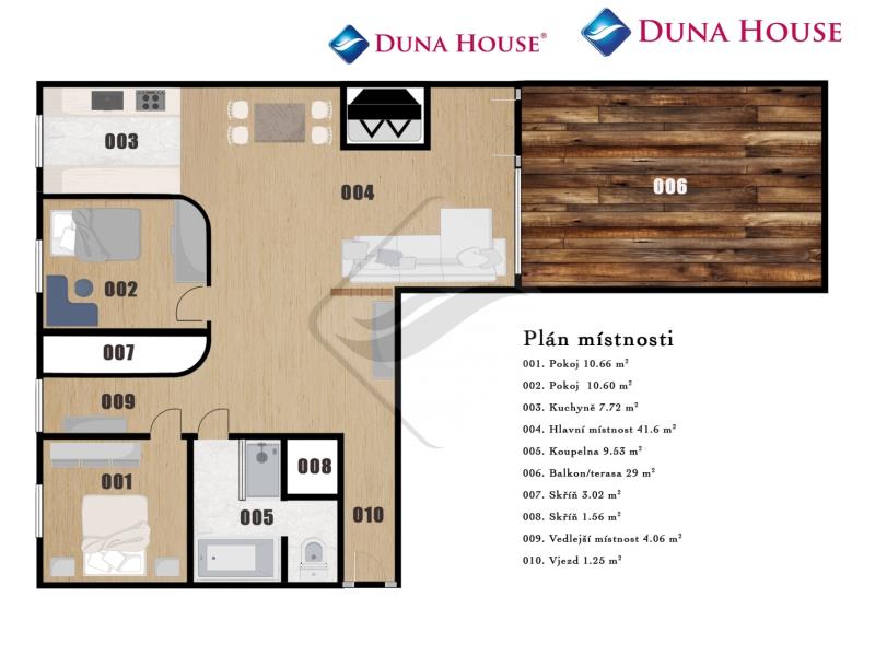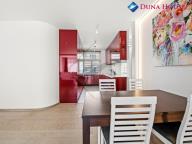 Dispozice bytu tvoři vstupní předsíň, srdcem bytu je vzdušně působící dispozice hlavního obytného prostoru s kompletně vybaveným kuchyňským koutem spotřebiči značky Siemens, jídelní a obývací částí, z které je vstup na slunnou terasu, krásna ložnice, světlý dětský pokoj, koupelna s vanou a sprchovým koutem.