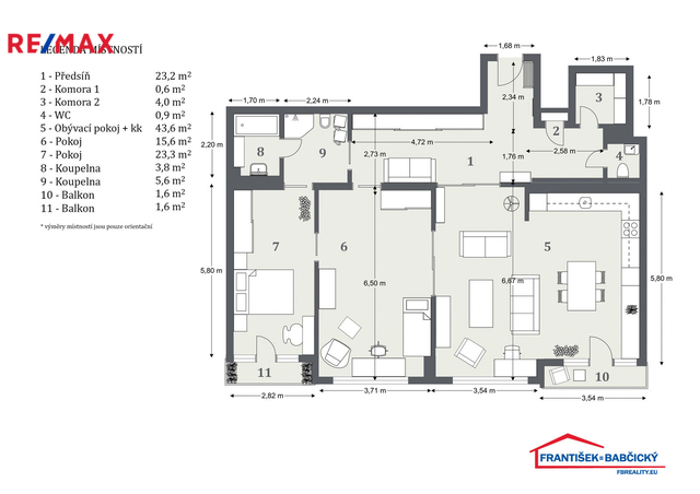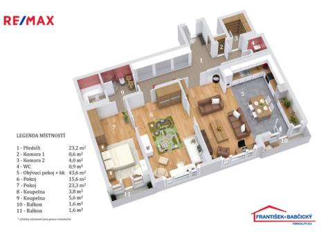 Byt disponuje prostornou předsíní (23,2 m²), která navazuje na obývací pokoj s kuchyňským koutem (43,6 m²). Dvě ložnice mají velikost 23,3 m² a 15,6 m². Součástí jsou dvě koupelny (3,8 m² a 5,6 m²), samostatné WC (1,9 m²) a dvě komory (0,6 m² a 4,0 m²). Dva balkóny (každý 1,6 m²) jsou orientovány do ulice.