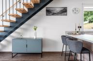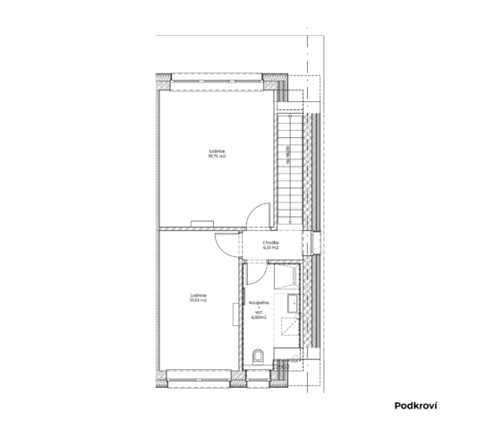 Interiér je rozdělen na část společenskou v 1. NP a klidovou v podkroví. Většinu společenské části zaujímá obývací pokoj spojený s kuchyňským koutem. Velká okna a posuvné dveře krásně prosvětlí obývací pokoj a zároveň umožňují vstup na balkon. Společenská část je dále členěna na předsíň a koupelnu s WC. Po schodišti vedoucím z obývacího pokoje lze vystoupat do podkroví, kde se nachází dva neprůchozí pokoje a druhá koupelna s WC.