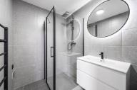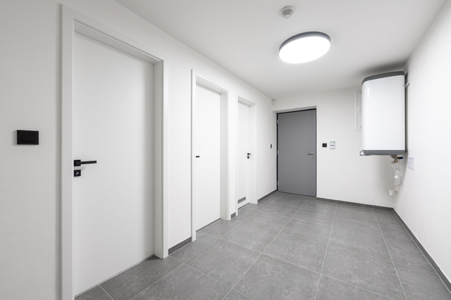 Apartmán je dokončen v nadstandardním provedení, které zahrnuje kvalitní plastohliníková okna a posuvné dveře typu HS portál s izolačním trojsklem, venkovní žaluzie, podlahové vytápění, v koupelnách navíc s topnými žebříky, nástěnné klimatizace ve všech obytných místnostech, elektrický zásobníkový ohřívač vody, zabezpečovací zařízení JABLOTRON s aplikací pro dálkové ovládání alarmu i celé domácnosti (ovládání klimatizace, topení či venkovních žaluzií jedním systémem), interiérové dveře bílé s obložkovými zárubněmi, lepené vinylové podlahy v kombinaci s keramickou dlažbou, obklady či sanitu od renomovaných výrobců.