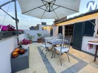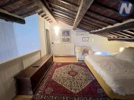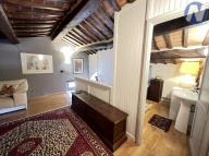 Apartmán s celkem 2 ložnicemi, 2 koupelnami a střešní terasou leží na dvou podlaží. Pokoje, zařízené v klasickém italském stylu, jsou světlé, tiché a plné elegance. V dolním podlaží se nachází ložnice, jejíž okna nabízejí nádherný výhled na věž San Agostino a údolí Val di Chiana. Zaujme vás svým pohodlím a tichem, stejně jako elegantní koupelna s mramorovými prvky a prostornou dřevěnou skříní. Je zde také prostorná obývací část s moderním krbem, která byla dříve používána jako kuchyně. Veškeré el. zásuvky a rozvody jsou zachované, a tak ji lze snadno přeměnit zpět na moderní kuchyni, což je ideální pro venkovní večeře na terase. Terasa je slunná a prostorná, ideální pro posezení s přáteli a rodinou.