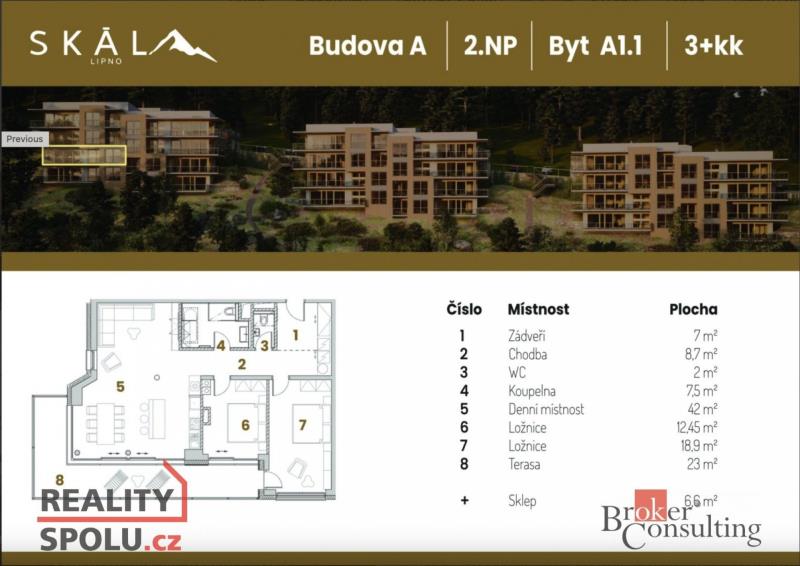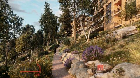 Představujeme jedinečný projekt Skála Lipno. Ojedinělá možnost vlastnit luxusní byt na jednom z nejkrásnějších míst v České republice. Místo, které nabízí neobyčejnou přírodu, vodní radovánky, horské túry a mnoho dalšího. Ano, mluvíme o Lipně nad Vltavou, kde právě vzniká projekt s 24 novými unikátními byty, které jsou určeny právě pro Vás.Vzdušný, prostorný a slunný byt, který má z každé obytné místnosti nerušený velkorysý pohled jižním směrem přes urostlé stávající stromy na jezero s navazujícím hřebenem šumavských kopců. Díky svažitosti terénu směrem k vodě a situováním domů na horní hranu svahu se tak každý byt stává jakousi rozhlednou nad Vltavou. Nabízený byt: C.1.1 3+kk o celkové ploše 132m2. V této ploše je zahrnuta terasa o výměře 23m2 a sklep který má výměru 7m2. Významným benefitem je podíl na honosně vytvořených společných prostorách ve kterých naleznete lyžárnu, kolárnu, technické místnosti, další samostatné budovy jako je společenská místnost s dětským koutem, budova wellness a budova pro uskladnění sportovního náčiní k vodě. Samozřejmostí je také soukromé molo. Projekt je navržený velmi komorně s maximálním důrazem na soukromí jeho obyvatel, proto jsou byty situovány do 3 samostatných domů a v každém z nich jen 8 bytů, jedná se tak spíše o viladomy. Terasy jsou navržené přes celou šířku jižních stěn i přes východní a západní nároží, což vytváří přirozený slunolam a brání nežádoucím letním tepelným ziskům bytů. A naopak nízké zimní slunce byty příjemně prosluní a prohřeje. Aby obyvatele neobtěžovaly provozní náklady na vytápění, dům je velkoryse zateplený a je řešeno tepelným čerpadlem a fotovoltaickými panely. Autonomii bytu podpoří vlastní krb na dřevo s komínem. Tento projekt není pouze o bytových jednotkách, ale díky komplexnímu zázemí společných prostor, nadstandardním službám a soukromému molu se jedná o životní styl. Pokud se nespokojíte s průměrem a očekáváte od nemovitosti nejvyšší standardy, bude Skála Lipno nemovitost právě pro Vás.