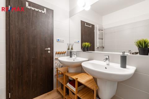 Interiér bytu o velikosti 97,2 m² je světlý a velmi prakticky řešený. Obývací pokoj s kuchyňským koutem plynule navazuje na terasu a vytváří otevřený prostor pro společné chvíle. Dvě samostatné ložnice poskytují dostatek soukromí. Koupelna je vybavena vanou, sprchovým koutem a dvěma umyvadly, toaleta je samostatná. Komfort bydlení doplňuje komora přímo v bytě, ideální pro uskladnění věcí.