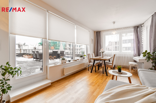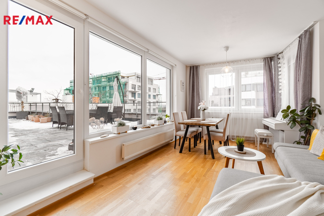 Dominantou bytu je velkorysá terasa o velikosti 55 m², která se stává přirozeným centrem každodenního života. Je ideálním místem pro ranní kávu, dětské hry na čerstvém vzduchu i večerní posezení s přáteli. Terasa dodává bytu pocit domu a nabízí prostor, který je v městském bydlení skutečně výjimečný.