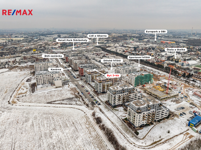 V bezprostředním okolí se nachází několik dětských hřišť, venkovní fitness a workout zóny, multifunkční sportovní hřiště, parky a cyklostezky, ideální pro běh, procházky i rodinné vyjížďky na kole. Lokalita nabízí kompletní zázemí pro rodiny – školky, školy, kroužky i služby. V krátké dojezdové vzdálenosti jsou také Retail Park Štěrboholy, Europark a Fashion Arena, které zajistí veškeré nákupy i volnočasové vyžití.