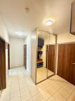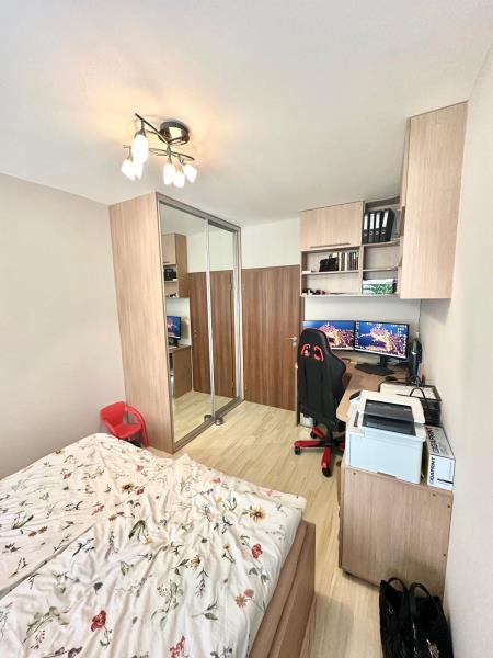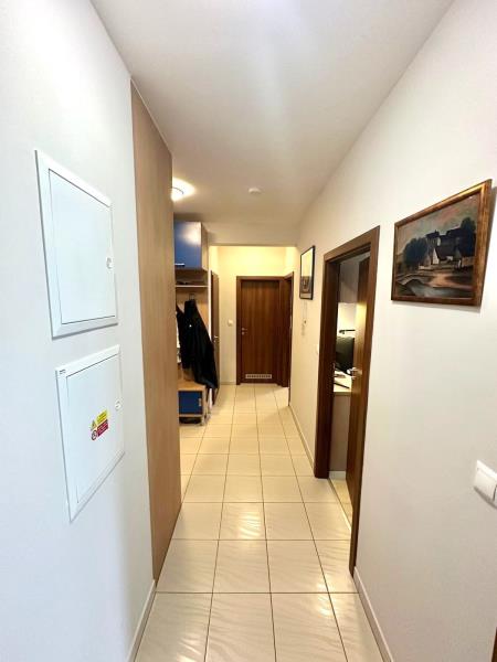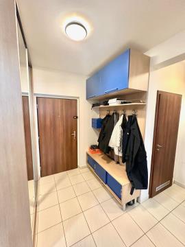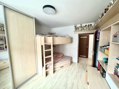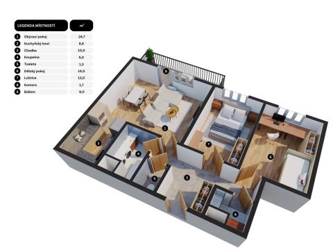 Vstupem do bytu se ocitnete v předsíni o ploše 10 m2, z které je vstup do všech obytných místností. Po levé straně od vstupu se nachází obývací pokoj o ploše 5,6 x 4,4 m ( 24,7 m2 ) s kuchyňským koutem o ploše 3,8 x 2,27 m ( 8,6 m2 ), který je ve výklenku a tím nezasahuje do obytné plochy pokoje. Z obývacího pokoje je vstup na balkon o ploše 9 m2 s výhledem do okolí. Po levé straně od obývacího pokoje se nachází koupelna o ploše 5 m2 s vanou, umývadlem a prostorem na pračku a sušičku. Vedle koupelny je umístěna samostatná toaleta o ploše ( 1,3 m2 ) s umývadlem. Proti vstupu do bytu je vstup do ložnice o ploše 2,95 x 4,4 m ( 13 m2 ) a hned vedle ložnice se nachází dětský pokoj o ploše 3,2 x 4,4 m ( 14 m2 ). Oproti dětskému pokoji je ještě umístěna komora o ploše 1,7 x 1 m ( 1,7 m2 ).