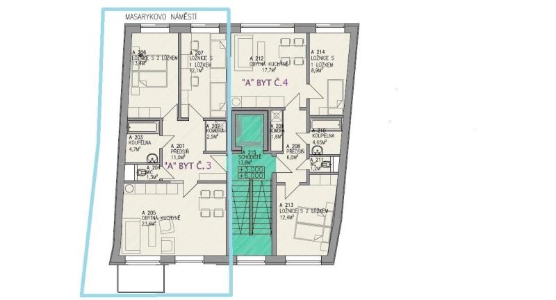 K prodeji nabízíme novostavbu bytu 3 KK, 66 m2, s balkonem, na adrese: Masarykovo nám. 47, Bystřice nad Pernštejnem. Jedná se o byt v 3 NP 2 patře s výtahem. Orientace bytu: Výhled na náměstí je z obou ložnic (SV), obývací pokoj s balkonem na JZ. K bytu je možno dokoupit parkovací místo ve vnitrobloku. Lokalita zajišťuje majitelům dokonalé soukromí přímo v centru města. Architektura s pokorou doplňuje historickou zástavbu a ctí ducha místa. Projekt je v současnosti realizován, dokončení projektu předpokládá rok 2027. Proto jsou ceny jsou zaváděcí a také financování bude z tohoto důvodu řešeno postupně. V první fázi rezervační záloha 10 % z celkové ceny bytu, po prohlášení vlastníka (rozdělení již hotové budovy na jednotlivé byty) další záloha do výše 50% celkové ceny, po kolaudaci nemovitosti se doplatí zbývající část. Tento způsob financování je velmi oblíbený, protože nabzí zájemci variabilitu a umožňuje si připravit odpovídající Cash flow s předstihem v klidu a bez rizika. Projekt je navržen tak, aby byl cenově dostupný, aniž bychom slevili z kvality provedení. Nabízíme moderní standardy bydlení, energetickou úspornost a promyšlené dispozice. Bydlet v developerském projeku: Rezidenci N°47 (pod tímto názvem najdete i internetové stránky) znamená mít obchody, služby, školy i kulturu na dosah ruky a zároveň se vracet do domu, který reprezentuje klid a pohodu. Firma Suniversal stavby, která tento projekt zaštiťuje, je mimo jiné, také zhotovitelem úžasného volnočasového projektu v Opatově (kousek za Třebíčí) apartmanyopatov. Vychází se i zde z dlouholetých zkušeností a vysokých standardů, kvality a to vše za přiznivé ceny, tak aby bydlení bylo dostupné každému. Více informací u makléře