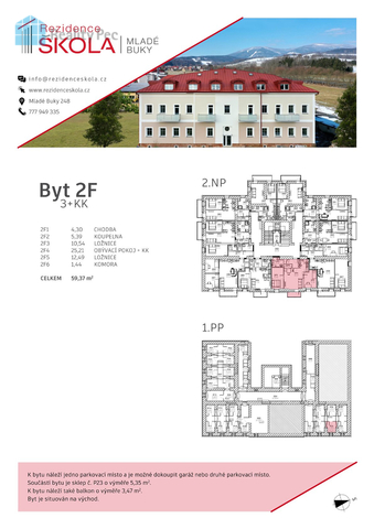 Exkluzivně nabízíme prodej bytu 3+kk s užitnou plochou 59,37 m2 byt se nachází v moderním rezidenčním projektu v centru obce Mladé Buky. Nově zrekonstruovaná budova "staré školy" se přeměnila na bytový dům s 28 byty. Dům s výtahem zajišťuje pohodlné bydlení pro všechny věkové skupiny. Díky kvalitnímu provedení a nízkým nákladům na provoz nabízí ideální podmínky pro každodenní život. Byt je navržen s důrazem na komfort a funkčnost. Byt se nachází ve 2.NP s balkónem orientovaným na východ a výhledem, parkovací stání a sklep jsou samozřejmostí. Nabízí se i možnost dokoupení garáže. Atraktivní lokalita a vysoká poptávka po ubytování zaručují výhodnou investici. Byty jsou ideální pro trvalé bydlení, dlouhodobý pronájem či rekreační využití, což umožňuje stabilní příjmy. Mladé Buky jsou malebnou obcí s výjimečnou polohou mezi městem Trutnov a horskými středisky Krkonoš. Pouhých 15 minut od Trutnova a 20 minut od Pece pod Sněžkou nabízí snadný přístup ke všem potřebným službám, stejně jako k lyžařským areálům, turistickým trasám či golfovému hřišti. V bezprostřední blízkosti se nachází nejen přírodní krásy, ale i široká škála volnočasových aktivit. Mladé Buky jsou ideálním místem pro klidný život, rekreaci i aktivní odpočinek. Neváhejte nás kontaktovat pro více informací či prohlídku bytu.