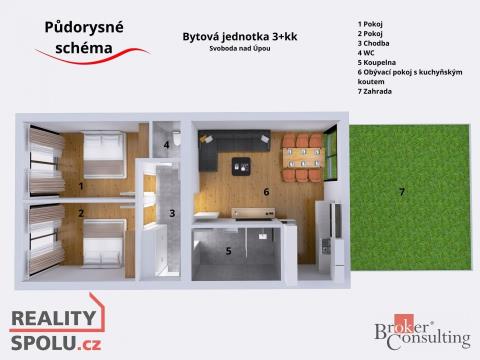 Nabízíme ke koupi ve Svobodě nad Úpou kompletně vybavenou bytovou jednotku (veškerý nábytek a spotřebiče jsou součástí prodeje) 3+KK. K bytu náleží 2 předzahrádky, zděná komora a 3 parkovací stání. Město se nachází v údolí řeky Úpy a je obklopeno nádhernou přírodou, což ho činí atraktivním cílem pro milovníky turistiky, horské cyklistiky, lyžování a další venkovní aktivity. Město Svoboda nad Úpou je ideálním výchozím bodem pro objevování krás Krkonoš a nabízí řadu ubytovacích možností, restaurací a obchodů, které uspokojí potřeby návštěvníků. Je to oblíbené místo pro rekreaci a relaxaci, v zimním období, kdy mnoho lidí přichází za lyžováním a snowboardingem a v létě v rámci horské turistiky. Kolaudace bytového domu proběhla v roce 2024. Byt je připraven k okamžitému předání. Dispozičně nabídne obývací pokoj s kuchyňským koutem, dvě samostatné ložnice. Koupelna disponuje walk in sprchou a WC, Je zde navíc další samostatné WC. Všechna okna jsou připravena na osazení elektrických venkovních rolet na dálkové ovládání. Náklady na provoz bytu jsou velmi nízké i s ohledem energetické náročnosti budovy a výše příspěvku do fondu oprav. Součástí předání budou i tři výhradní parkovací stání a komora nacházející se v 1. NP. Provoz do lyžařských center zajišťuje SkiBus. Budu se těšit na Vaše kontaktování.