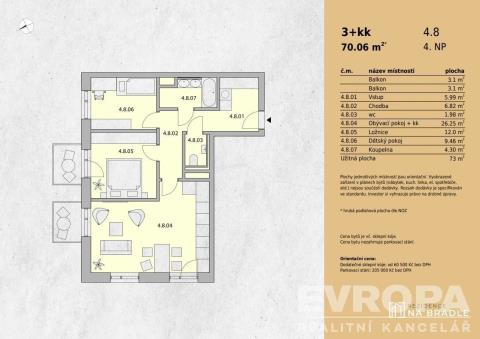 Nabízíme Vám prodej bytu 3+kk o výměře 73 m2, s balkónem o velikosti 6,2 m2, který se nachází v 4.NP bytového domu s názvem Rezidence Na Bradle. Byt je součástí výstavby jedinečného nízkoenergetického bytového domu v klidné části města Světlá nad Sázavou. Minimalistický dům s osobitými proporcemi a důvtipem přinese dostupné a komfortní bydlení v samotném srdci republiky v podobě 43 bytů. Pětipodlažní dům s vlastním parkováním, s vysokým standardem provedení a s elegantní architekturou bude okrasným prvkem pro lokalitu. Vybavení bytu obsahuje plně vybavenou koupelnu, podlahy, osazení zárubní a dveří. Zvolené materiály jsou vybrány ve vysoké kvalitě a spolehlivosti. Vytápění bytu bude prostřednictvím teplovodního podlahového topení. Dodávku tepla bude zajišťovat společná kotelna. Podrobnější technickou specifikaci zašleme na přání zákazníka. V ceně bytu je sklepní kóje, která se nachází v 1.PP bytového domu. K bytu je možné dokoupit vyhrazené parkovací stání za cenu 250.000, Kč. S financováním rádi pomůžeme. V případě zájmu nebo pro více informací mne neváhejte kontaktovat.