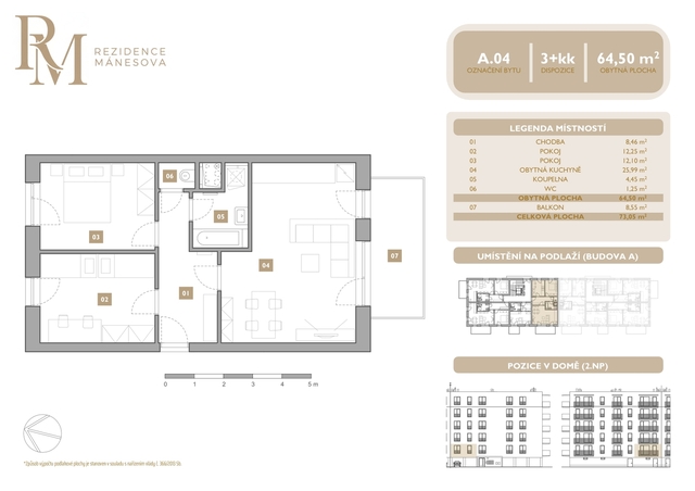 Prostorný rodinný byt 3+kk s velkým balkonem v projektu Rezidence Mánesova v Lipníku nad Bečvou nabízí nadstandardní komfort v moderním provedení. Byt je vybaven vinylovými podlahami, podlahovým teplovodním topením, kuchyňskou linkou v ceně bytu, přípravou pro venkovní žaluzie a u bytů ve 4.–6. NP také přípravou na klimatizaci. Interiérové prvky je možné zvolit ve světlé (2NP, 4NP, 6NP) nebo tmavé variantě (3NP, 5NP). Součástí prodeje je nutnost zakoupení vnitřního parkovacího stání, k bytu lze také dokoupit sklepní kóji. Rezidence Mánesova kombinuje vysoký standard, moderní architekturu a klidné prostředí menšího města s výbornou dostupností do Přerova i Olomouce. Rezidence se nachází v klidné části města s kompletní občanskou vybaveností – obchody, školy, restaurace i zastávka veřejné dopravy jsou v docházkové vzdálenosti. Kvalita provedení odpovídá olomouckým projektům, ale s výrazně dostupnější cenou. Dokončení výstavby 12/2026.