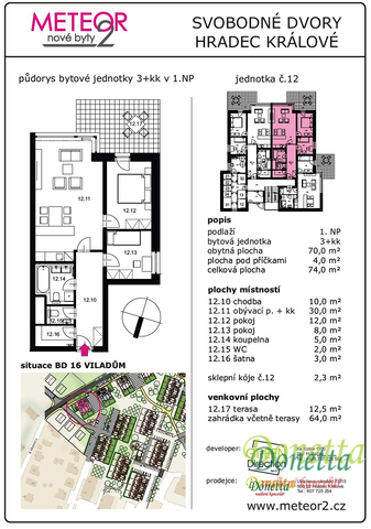 Nová moderní bytová jednotka 3+kk (byt č. 12) se zahrádkou a s terasou se nachází v ulici K Meteoru v Hradci Králové, v části Svobodné Dvory. Jedná se o byt v novostavbě bytového domu, jehož výstavba byla zahájena na počátku roku 2025 a bude k dispozici nejdéle na konci léta roku 2026.