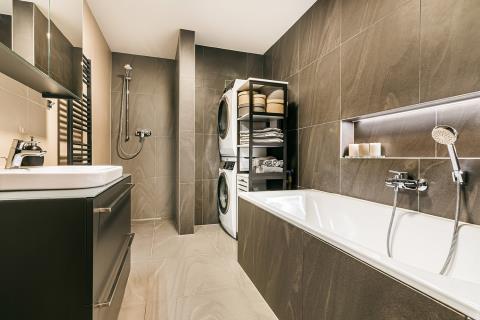 Koupelna disponuje vanou i walk-in sprchovým koutem, umyvadlem s umyvadlovou skříňkou, zrcadlovou skříňkou, topným žebříkem, pračkou a sušičkou.