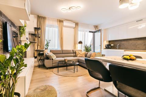 Kuchyňský kout je plně vybaven vestavěnými spotřebiči - lednice, myčka na nádobí, trouba, mikrovlnná trouba a indukční varná deska. Součástí kuchyně je také ostrůvek a jídelní stůl se židlemi.