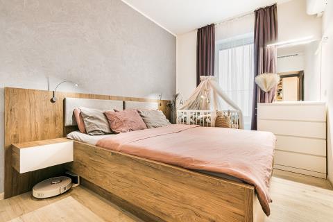 Ložnice je vybavena manželskou postelí s nočními stolky, komodou a vestavěnou šatní skříní.