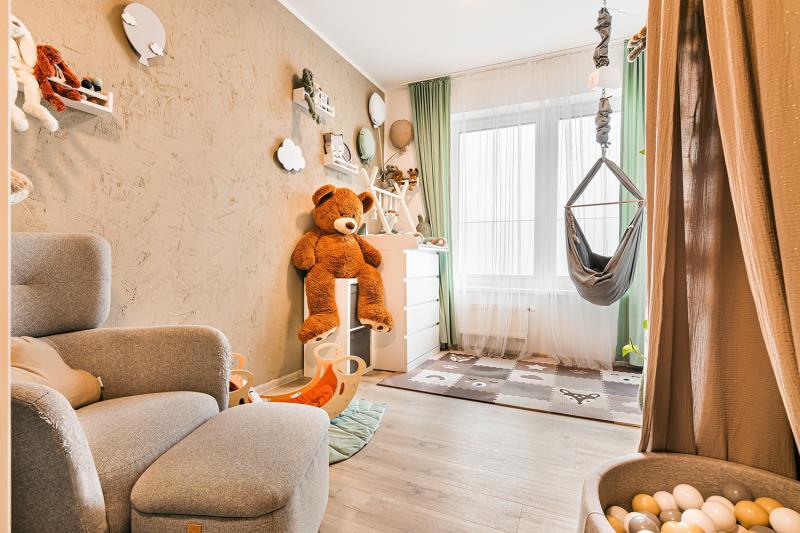 Dětský pokoj s pracovním koutem je vybaven otevřenou šatní skříní, komodou, poličkami, křeslem s lenoškou, pracovním stolem se židlí a policí s otevřenými boxy.