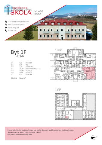 Exkluzivně nabízíme prodej bytu 3+kk s užitnou plochou 76,86m2 byt se nachází v moderním rezidenčním projektu v centru obce Mladé Buky. Nově zrekonstruovaná budova "staré školy" se přeměnila na bytový dům s 28 byty. Dům s výtahem zajišťuje pohodlné bydlení pro všechny věkové skupiny. Díky kvalitnímu provedení a nízkým nákladům na provoz nabízí ideální podmínky pro každodenní život. Byt je navržen s důrazem na komfort a funkčnost. Byt se nachází v 1.NP orientovaným na severovýchod, parkovací stání a sklepní kóje jsou samozřejmostí. Nabízí se i možnost dokoupení garáže nebo druhého parkovacího místa. Atraktivní lokalita a vysoká poptávka po ubytování zaručují výhodnou investici. Byty jsou ideální pro trvalé bydlení, dlouhodobý pronájem či rekreační využití, což umožňuje stabilní a ziskové příjmy. Mladé Buky jsou malebnou obcí s výjimečnou polohou mezi městem Trutnov a horskými středisky Krkonoš. Pouhých 15 minut od Trutnova a 20 minut od Pece pod Sněžkou nabízí snadný přístup ke všem potřebným službám, stejně jako k lyžařským areálům, turistickým trasám či golfovému hřišti. V bezprostřední blízkosti se nachází nejen přírodní krásy, ale i široká škála volnočasových aktivit. Mladé Buky jsou ideálním místem pro klidný život, rekreaci i aktivní odpočinek. Neváhejte nás kontaktovat pro více informací či prohlídku bytu.