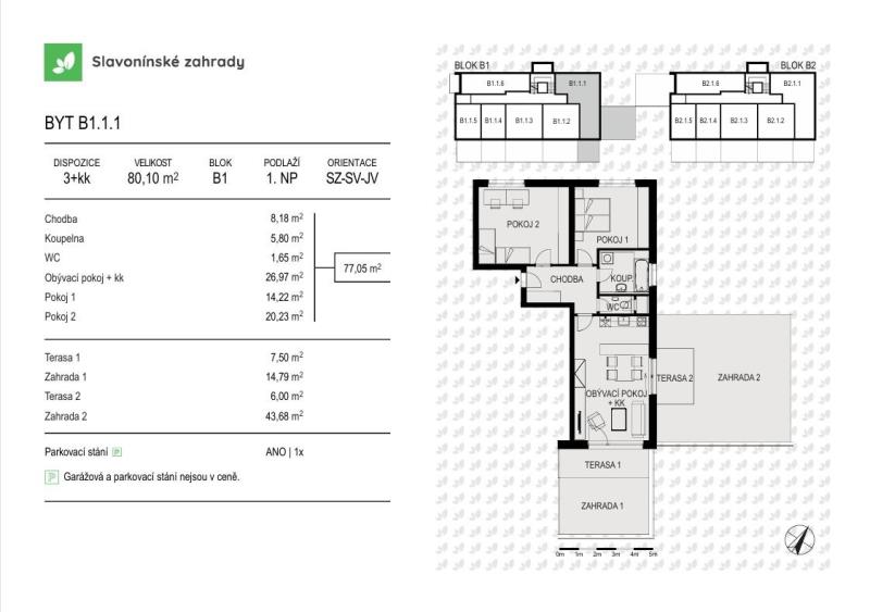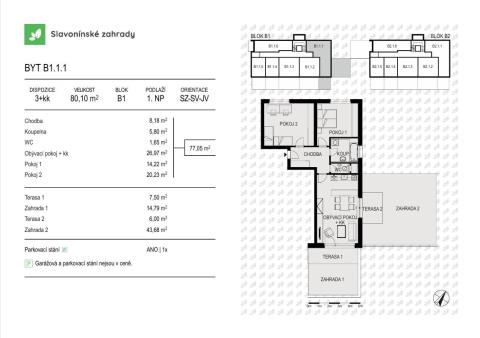 Nabízíme prostorný byt s označením B1.1.1 o dispozici 3+kk, podlahové ploše 80,1 m2 v 1. NP, s terasou 14,4 m2 a soukromou zahradou 60,1 m2 ideální pro rodiny s dětmi, páry i milovníky venkovního života.