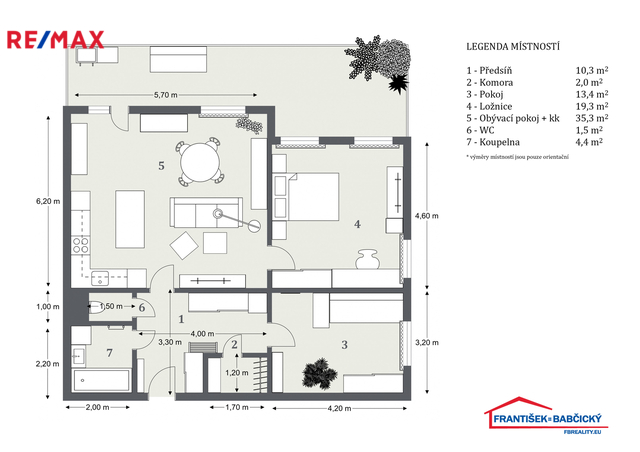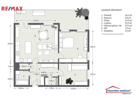 Dispozice bytu je velmi praktická a promyšlená – tvoří ji prostorný obývací pokoj s kuchyňským koutem o výměře 35,3 m², ze kterého je přímý vstup na vlastní zahrádku, dále dvě samostatné ložnice o velikosti 19,2 m² a 13,4 m², vstupní chodba o ploše 11,2 m², koupelna o velikosti 4,4 m² s vanou a vyhřívanou podlahou, samostatná toaleta 1,5 m² a praktická komora či šatna o výměře 2 m², přičemž celková plocha bytu činí 86,9 m².