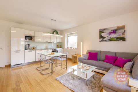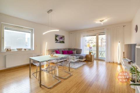 Byt sestává ze vstupní chodby (15,20m2), obývacího pokoje s kuchyňským koutem (28,70m2) a vstupem na balkón (5m2), ze kterého je krásný výhled do přilehlého parku. Kuchyň je vybavena moderními spotřebiči, včetně sklokeramické varné desky, elektrické trouby, mikrovlnné trouby, myčky, kombinované lednice, kávovaru a digestoře. Dále je zde ložnice (12,20m2) s vlastní koupelnou se sprchovým koutem a WC (3,40m2), dětský pokoj/pracovna (10,90m2) druhá velká koupelna (6,20m2) a samostatné WC (2,20m2).