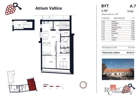 Hledáte nový byt, který si můžete dotvořit přesně podle svých představ? V developerském projektu Atrium Valtice nabízím prostorný byt A7 o dispozici 3+kk, který kombinuje moderní bydlení, skvělou lokalitu a klidné zázemí v uzavřeném areálu. Byt je ideální volbou pro ty, kdo chtějí čistý začátek – bez kompromisů a s možností navrhnout si interiér přesně podle sebe. Díky vizualizacím v inzerátu si navíc můžete snadno představit jeho budoucí podobu. Popis nemovitosti: Byt o celkové ploše 89,30 m² se nachází ve 2. nadzemním podlaží novostavby zkolaudované v roce 2023. Dominantou bytu je prostorný obývací pokoj s kuchyňským koutem (32 m²), který nabízí dostatek místa pro rodinný život i setkávání s přáteli. Dále zde najdete dvě samostatné ložnice, šatnu, koupelnu, samostatné WC a prakticky řešené chodby. Dispozice je přehledná a funkční, s důrazem na využití každého metru. Byt je nabízen bez vybavení, což vám dává maximální svobodu při zařizování – od kuchyňské linky až po finální styl interiéru. Hlavní výhody: • novostavba zkolaudovaná v roce 2023 • energetická náročnost B = nízké provozní náklady • parkovací stání v uzavřeném areálu projektu • klidný vnitroblok v centru města • možnost výrazné slevy na kuchyň na míru • možnost zajištění kompletního návrhu a vybavení bytu • zajistíme výhodné financování Lokalita: Valtice patří mezi nejžádanější lokality jižní Moravy – nejen díky vinařské tradici, ale i příjemné atmosféře a kompletní občanské vybavenosti. Projekt Atrium Valtice se nachází přímo v centru města, přesto nabízí klid díky uzavřenému vnitrobloku. V docházkové vzdálenosti máte obchody, restaurace, služby i krásnou přírodu Lednicko-valtického areálu. Pro koho je byt ideální: Tento byt je skvělou volbou pro pár nebo menší rodinu, která hledá moderní bydlení bez kompromisů a chce si interiér vytvořit přesně podle svého stylu. Zároveň dává smysl i jako investice – kvalitní novostavby v této lokalitě mají dlouhodobě stabilní hodnotu. Další možnosti v projektu: Jedná se o jeden z posledních bytů v tomto projektu. Pokud by vám dispozice 3+kk nevyhovovala, aktuálně jsou k dispozici i další varianty: • 2+kk s terasou (64,30 m²) • 2+kk (56,50 m²) • 2+kk (56,50 m²) • 1+kk (49,60 m²) Rád vás tímto bytem osobně provedu a ukážu vám jeho potenciál přímo na místě. Zájem o nové byty ve Valticích je dlouhodobě vysoký, proto doporučuji domluvit si prohlídku co nejdříve. Ozvěte se mi – společně najdeme řešení přesně pro vás.