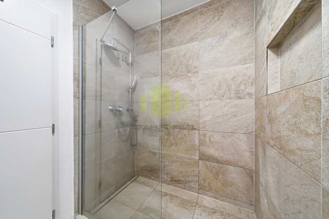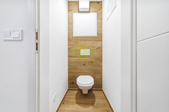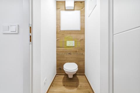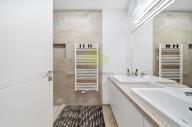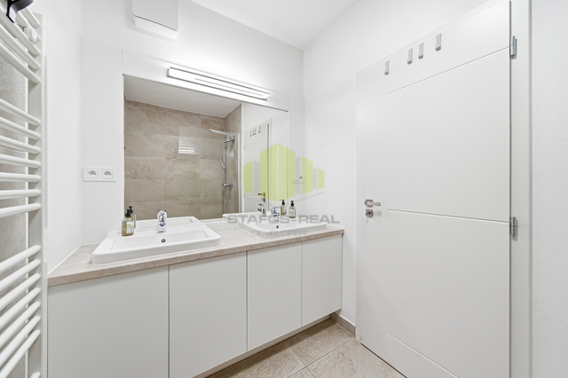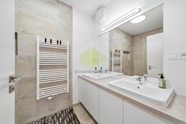 Koupelna je provedena v moderním stylu s velkoformátovou dlažbou a nabízí sprchový kout typu walk-in, dvojité umyvadlo a otopný žebřík. Samostatná toaleta je oddělená a designově sladěná se zbytkem bytu.