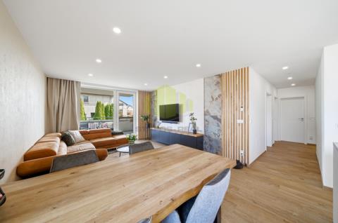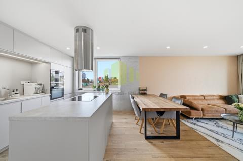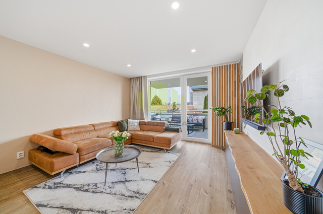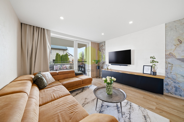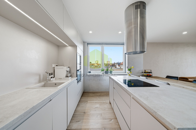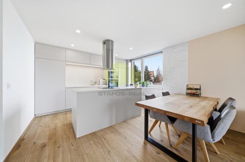 Dominantou bytu je otevřený obytný prostor s kuchyňskou linkou vyrobenou na míru v moderním bezúchytkovém designu, doplněnou o ostrůvek s varnou deskou. Kuchyně je vybavena vestavěnými spotřebiči, designovou stropní digestoří a kvalitní pracovní plochou. Obývací část působí velmi vzdušně a je doplněna o designové prvky, jako jsou lamelové obložení či dekorativní stěny, které podtrhují celkový moderní charakter bytu.