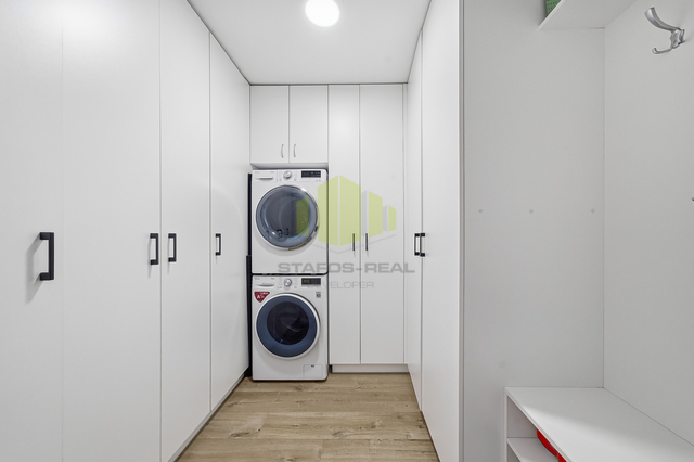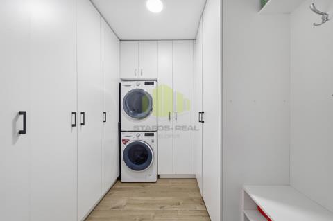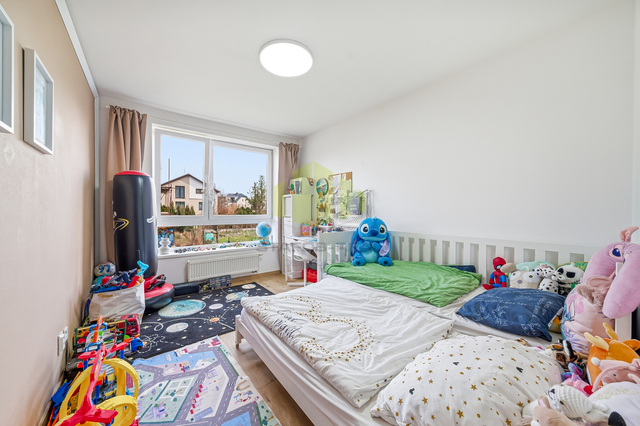 Ložnice nabízí klidné zázemí s přímou návazností na šatnu, dětský pokoj je plnohodnotný a světlý. Praktickým prvkem je technická místnost s pračkou, sušičkou a vestavěnými skříněmi, která výrazně zvyšuje komfort každodenního bydlení.