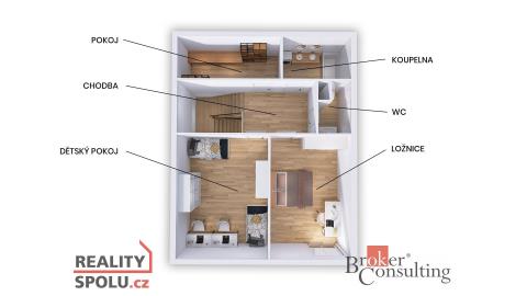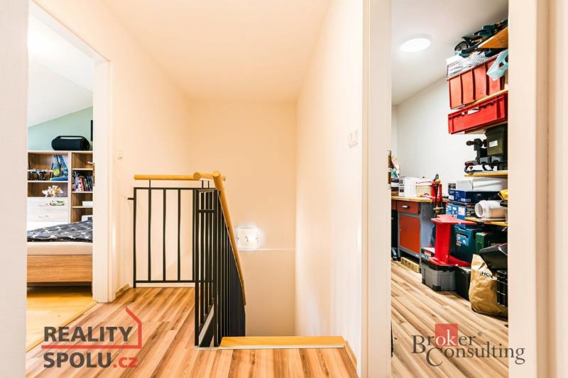 Horní podlaží tvoří klidovou část bytu. Nachází se zde dva prostorné pokoje, koupelna, samostatné WC a velkorysá komora, která poskytuje nadstandardní množství úložného prostoru. Další úložné možnosti zajišťují vestavěné skříně v předsíni, koupelně i ložnici.