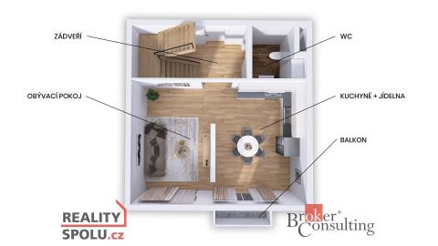 Dominantou spodního podlaží je prostorný obývací pokoj s kuchyňským koutem, který přirozeně propojuje vaření, stolování i relaxaci. Z obývacího prostoru je vstup na balkon. Ve spodním podlaží se dále nachází vstupní chodba se schodištěm a samostatné WC.