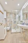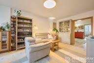 Jihovýchodní část — obývací pokoj s kuchyní a hlavní ložnicí — tvoří světlý celek s výhledem na zeleň. Severozápadní křídlo nabízí klidné prostředí ideální pro práci, dětské pokoje nebo odpočinek. Obě části propojuje prostorná hala. Byt má dvě koupelny, dvě samostatné toalety, bidet a bidetové sprchy — komfort, který se v této kategorii hledá jen výjimečně.