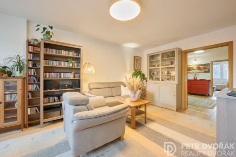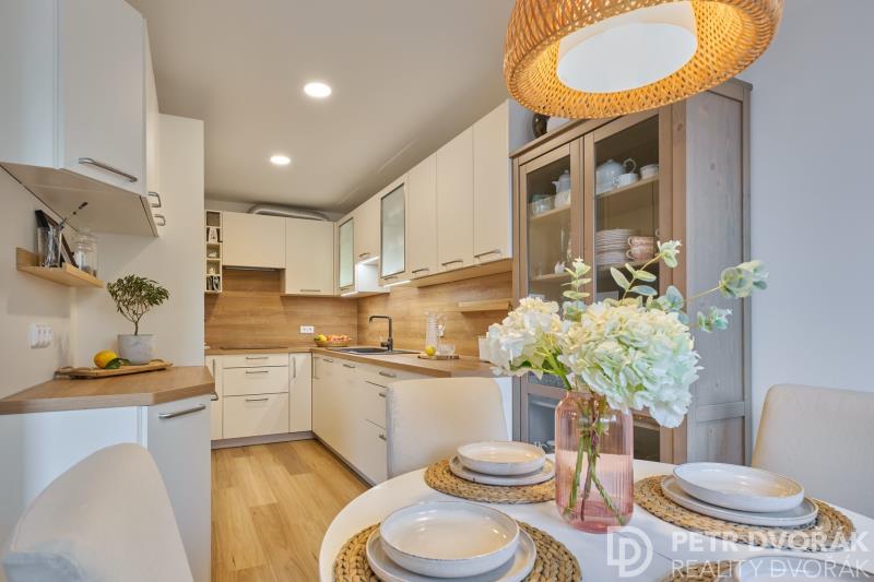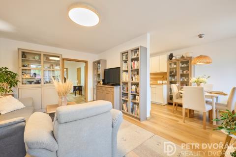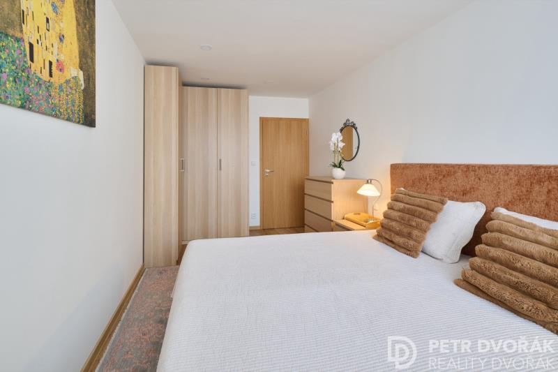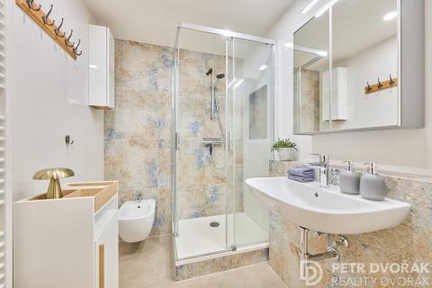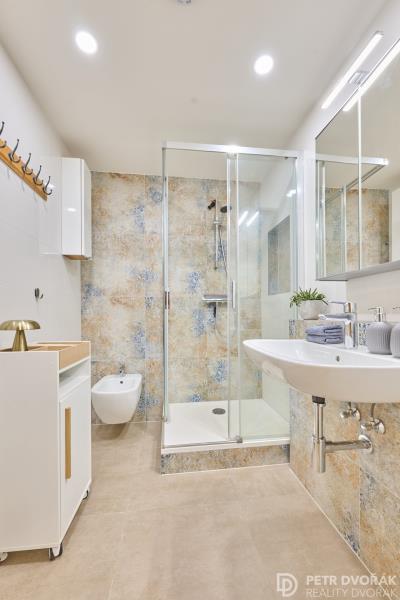 Byt prošel v roce 2024 kompletní rekonstrukcí odbornou firmou — nové rozvody elektřiny a vody, radiátory, podlahy včetně podkladů, kuchyňská linka i spotřebiče. Trojskla jsou vybavena elektricky ovládanými roletami na dálkové ovládání. Akusticky upravené stěny a stropy zajišťují skutečný klid v každé části bytu. Interiér dokreslují dveře z dubové dýhy sladěné s podlahou.