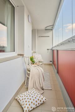 Lodžie o velikosti 6,9 m² s prosklením a deskami Fundermax je orientována do klidného zeleného dvorního prostoru. Plynová přípojka umožňuje přechod na samostatné vytápění nebo přípravu teplé vody.