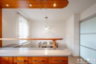 Součástí spodního patra je dále samostatná kuchyně s jídelnou, oddělitelná od ostatního bytového prostoru posuvnými designovými dveřmi. Kuchyňská linka na míru je vybavena plynovou sklokeramickou varnou deskou / je zde možnost i elektrické indukční desky/ a vestavnými spotřebiči – elektrickou troubou, myčkou a lednicí s mrazákem. Dřez je vybaven i drtičem odpadu.