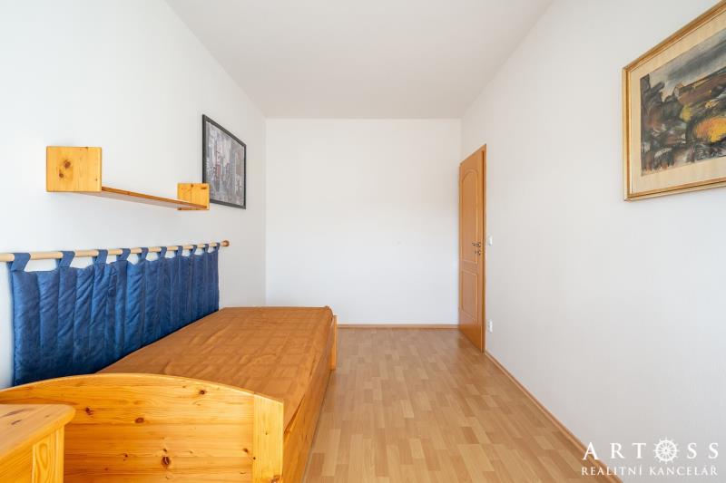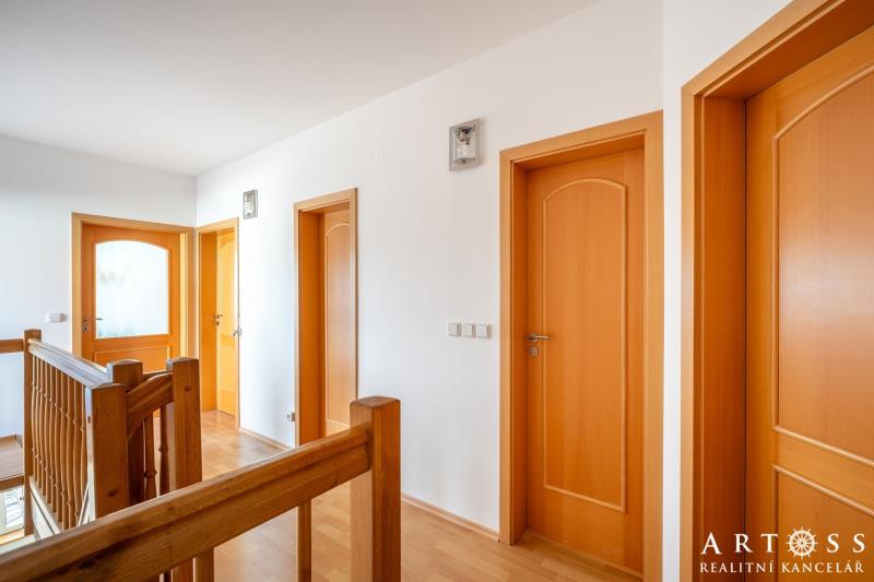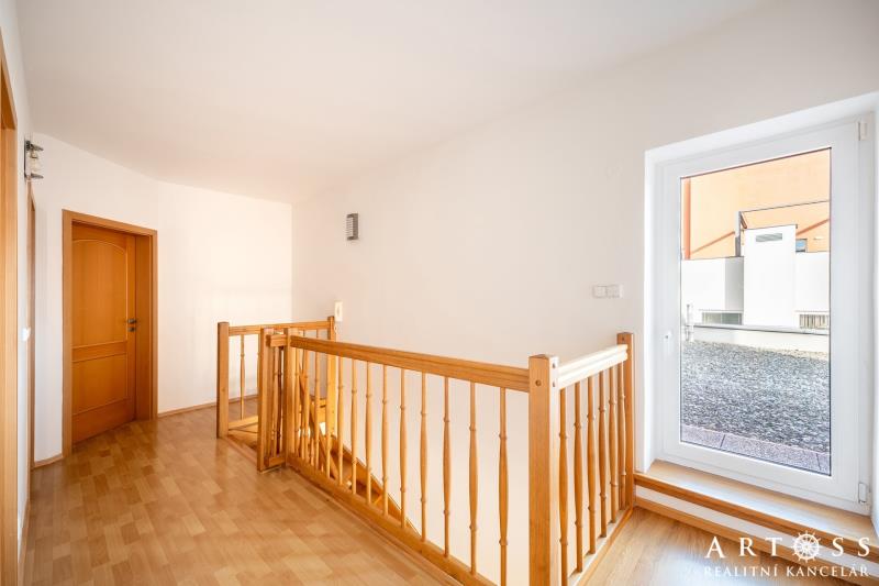 Horní patro slouží jako klidová zóna bytu. Nachází se zde ložnice a dva další pokoje, které poskytují dostatek soukromí každému členu domácnosti. Velkým benefitem je klimatizace ve všech pokojích v horním patře, která výrazně zvyšuje komfort zejména v letních měsících. V ložnici a jednom z dětských pokojů jsou vestavné skříně. V patře je druhá koupelna s vanou, opět s elektrickým podlahovým vytápěním a otopným žebříkem a samostatnou toaletou s malým umyvadlem. Obě podlaží propojuje elegantní dřevěné schodiště.