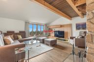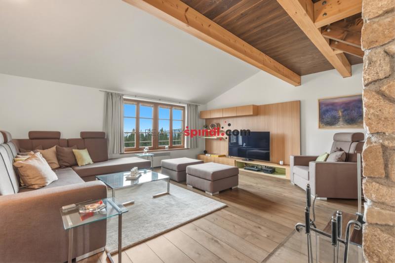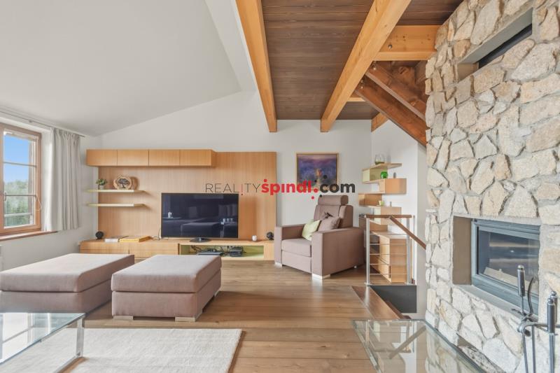 Dominantou bytu je velkorysý obytný prostor otevřený až do krovu s přiznanými masivními dřevěnými trámy. Kamenný krb (postavený z kamenů původního domu) zde tvoří přirozené srdce interiéru – místo, kde se po dni stráveném na horách setkává rodina i přátelé. Velkoformátová okna vpouštějí do prostoru dostatek denního světla a zároveň otevírají ničím nerušené výhledy do okolní krajiny.