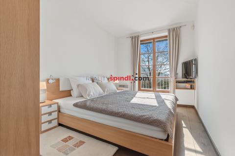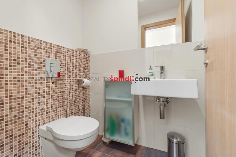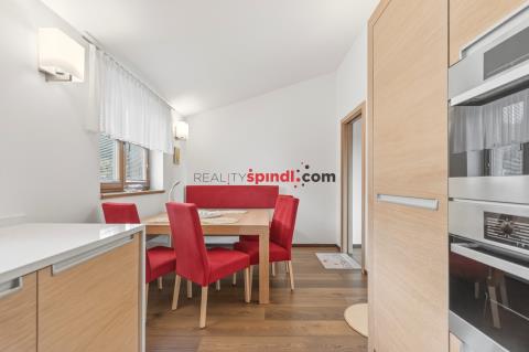 K bytu náleží garážové parkovací stání v přízemí domu a sklep. Ve společných prostorách je k dispozici lyžárna a klubovna. Dům disponuje kromě hlavního vstupu také samostatným letním vstupem ze zadní části, díky kterému se do bytu dostanete po několika schodech přímo a bez nutnosti procházet společnými prostory. Rezidence má pouze 16 jednotek, což zajišťuje vysokou míru soukromí i exkluzivity. Nabídky v této lokalitě se objevují jen zcela výjimečně.