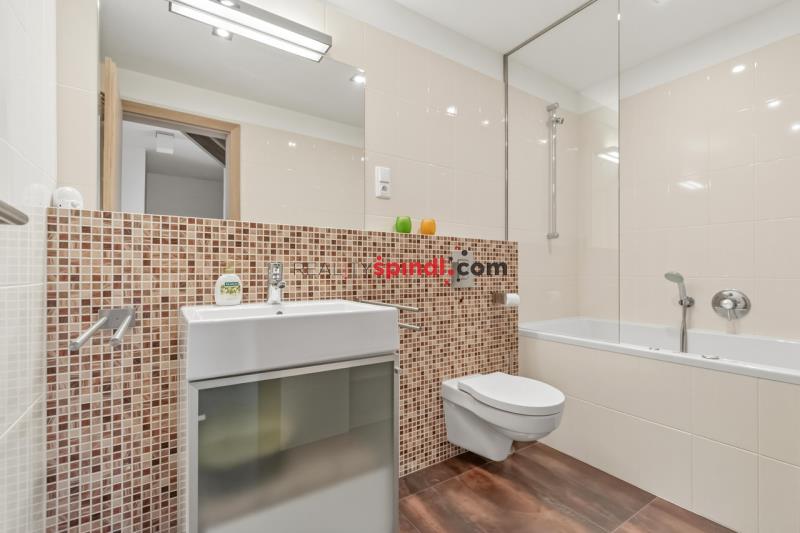 Součástí bytu je také privátní wellness zóna se saunou, sprchou a odpočinkovým prostorem – ideální místo pro regeneraci po dni stráveném na horách.