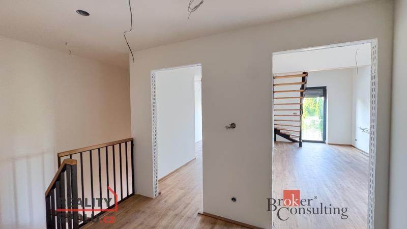 V druhém podlaží je chodba, dvě ložnice, šatna, koupelna s technickou místností a vstup do mezonetových prostor v podkroví, které nabízejí originální kombinaci pracovny a ložnice.