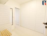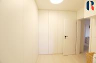 Na levé straně od vstupních dveří se nachází dva samostatné pokoje orientované na východní stranu. Na pravé straně je koupelna s vanou, umyvadlem a wc a samostatné wc. Vedle vstupních dveří se nachází samostatná místnost, která je využívána jako šatna a „technická místnost s vestavěnými skříněmi na míru, aby využily co nejvíce prostoru od podlahy ke stropu. Zajišťují v bytě maximální možnost úložných prostor a zároveň je zde umístěna pračka a sušička. Vstup do ložnice je pouze z této místnosti, čímž je oddělena od hlavní obytné části bytu a nabízí dokonalé soukromí. Při vstupu do ložnice je vlevo umístěna prosklená koupelna s matným sklem, sprchovým koutem a umyvadlem. Lodžie, kuchyň a ložnice jsou orientovány na západní stranu.