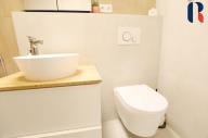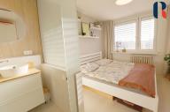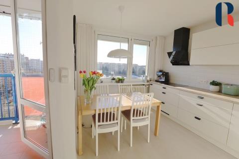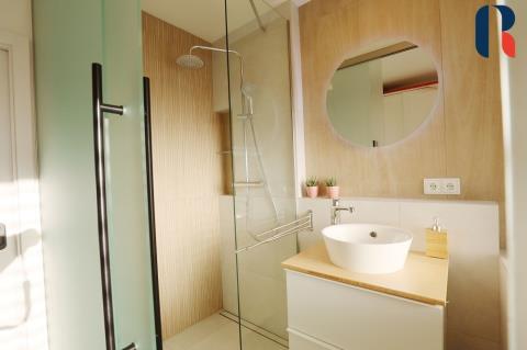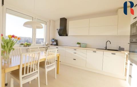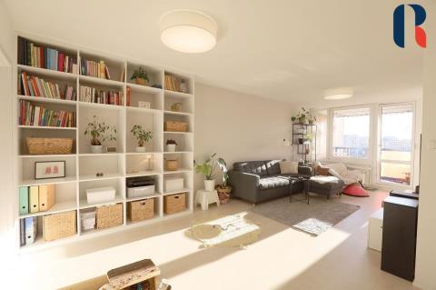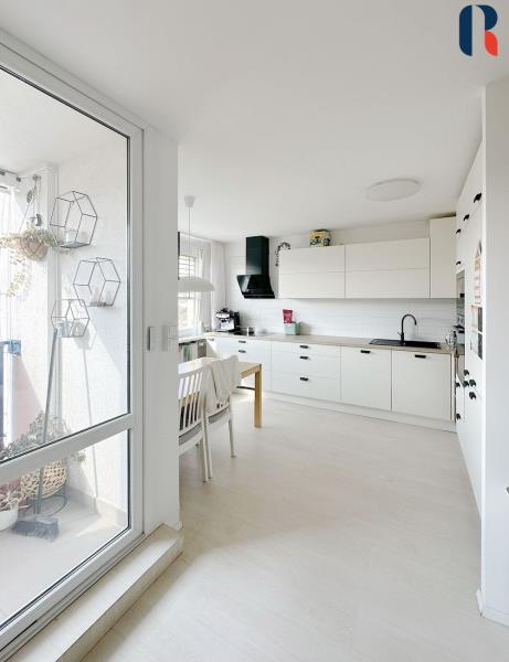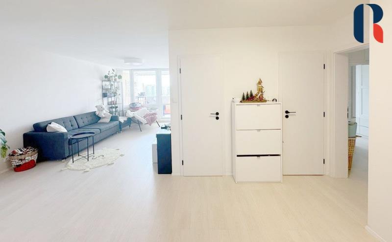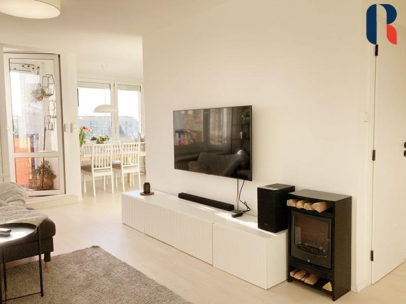 Při vstupu do bytu se ocitnete v prostoru, který se po rekonstrukci vymyká standardně řešeným panelovým bytům. Působí příjemným a útulným dojmem díky dostatku přirozeného světla, velkým oknům, pečlivě vybíranému a nadstandardně vybavenému interiéru.