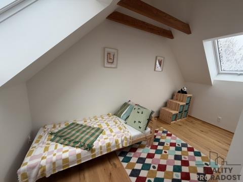 Podkroví (Noční část): Po schodech vystoupáte do klidové zóny, kde naleznete hlavní ložnici rodičů, druhý dětský pokoj a druhou koupelnu, což zajišťuje maximální komfort pro vícečlennou rodinu během ranní špičky.